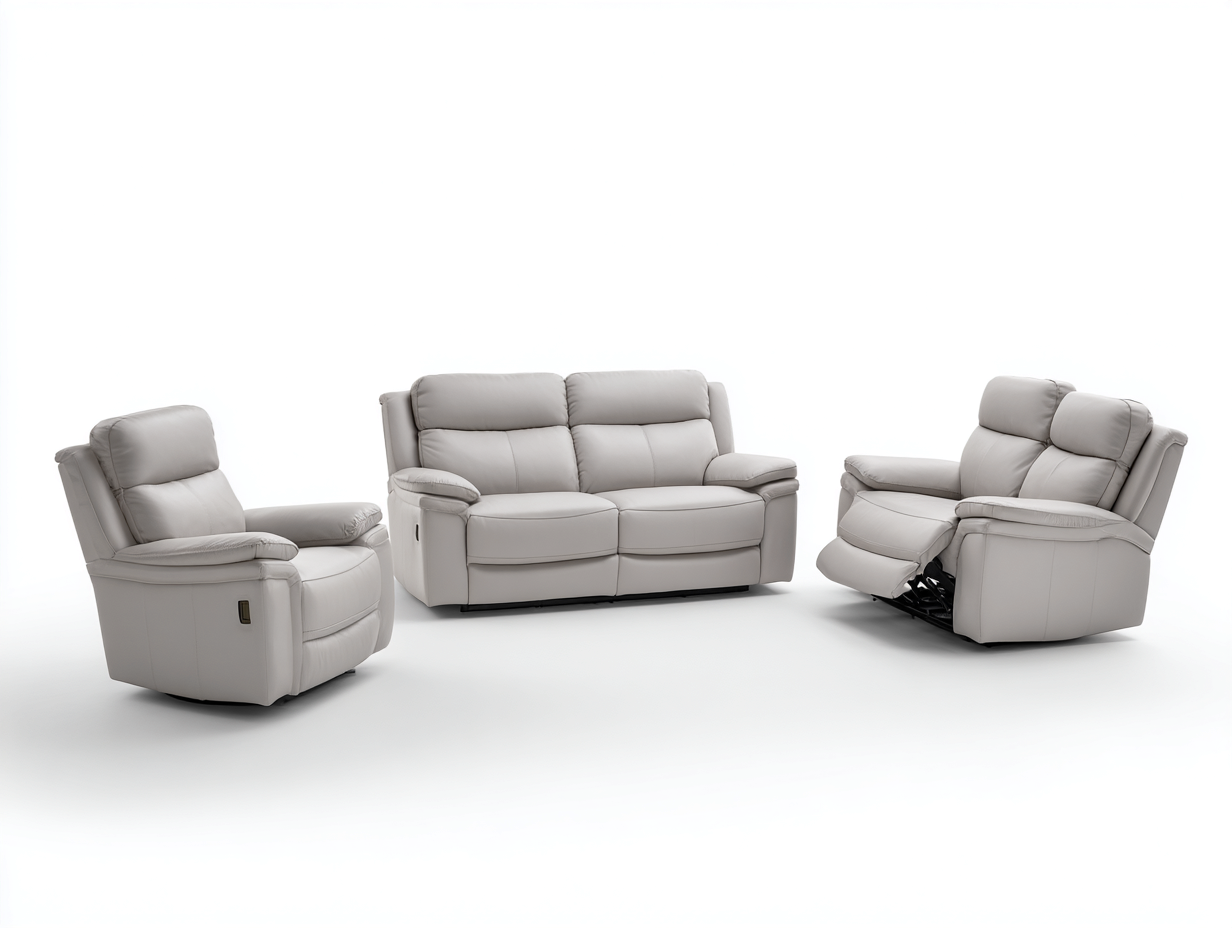Set divani con funzione relax composto da un divano 2 posti e due poltrone coordinate, progettato per ambienti soggiorno moderni. Il design armonioso e le forme ergonomiche offrono una soluzione confortevole per il relax quotidiano e la convivialità.