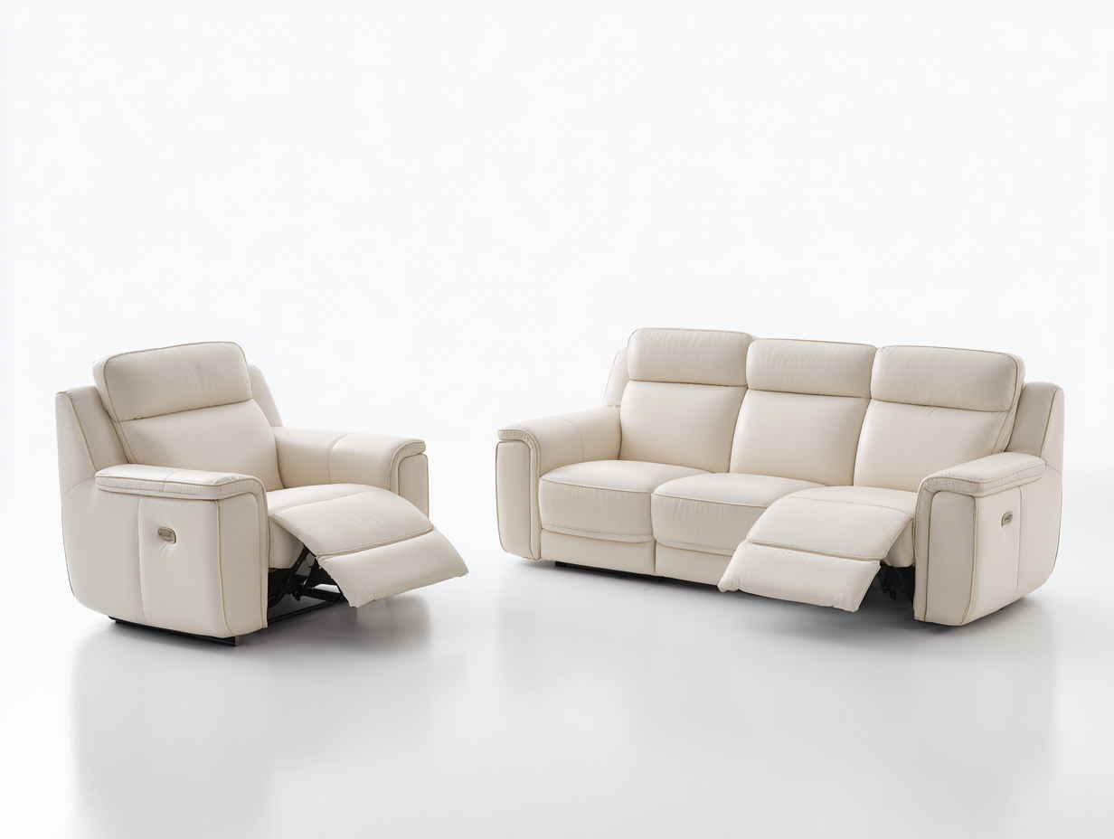 Set divani con funzione relax composto da un divano 3 posti e una poltrona coordinata, ideale per soggiorni moderni. Il design lineare e le forme morbide offrono un equilibrio tra estetica e comfort, adatto all'utilizzo quotidiano.